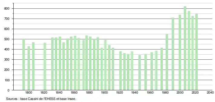 L'évolution du nombre d'habitants est connue à travers les recensements de la population effectués dans la commune depuis 1793. Pour les communes de moins de 10 000 habitants, une enquête de recensement portant sur toute la population est réalisée tous les cinq ans, les populations légales des années intermédiaires étant quant à elles estimées par interpolation ou extrapolation[50]. Pour la commune, le premier recensement exhaustif entrant dans le cadre du nouveau dispositif a été réalisé en 2006[51].