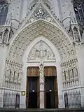 | statues monumentales de Saint Jacques, Saint André, Saint Pierre, Saint Paul, Saint Simon, Saint Thomas, etc. encadrant les trois portes de la façade | Nancy, basilique Saint-Epvre (portail)[34] | 1874 (avant) | .JPG.webp) | ||
