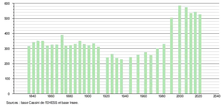 L'évolution du nombre d'habitants est connue à travers les recensements de la population effectués dans la commune depuis 1836. Pour les communes de moins de 10 000 habitants, une enquête de recensement portant sur toute la population est réalisée tous les cinq ans, les populations légales des années intermédiaires étant quant à elles estimées par interpolation ou extrapolation[16]. Pour la commune, le premier recensement exhaustif entrant dans le cadre du nouveau dispositif a été réalisé en 2006[17].