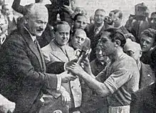 Sélection![]() Le président Albert Lebrun remet la Coupe Jules Rimet à Giuseppe Meazza, le 19 juin 1938.