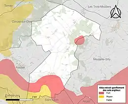 Les mouvements de terrains susceptibles de se produire sur la commune sont des affaissements et effondrements liés aux cavités souterraines (hors mines) et des tassements différentiels[21]. Afin de mieux appréhender le risque d’affaissement de terrain, un inventaire national permet de localiser les éventuelles cavités souterraines sur la commune[22]. Le retrait-gonflement des sols argileux est susceptible d'engendrer des dommages importants aux bâtiments en cas d’alternance de périodes de sécheresse et de pluie[23]. 17,9 % de la superficie communale est en aléa moyen ou fort (79,5 % au niveau départemental et 48,5 % au niveau national)[Carte 2]. Depuis le , en application de la loi ÉLAN, différentes contraintes s'imposent aux vendeurs, maîtres d'ouvrages ou constructeurs de biens situés dans une zone classée en aléa moyen ou fort[Note 4],[24].