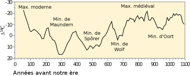- les variations à court terme, comme les cycles de taches solaires, et les épisodes plus longs, comme le minimum de Maunder, qui s'est produit pendant la partie la plus froide du petit âge glaciaire.