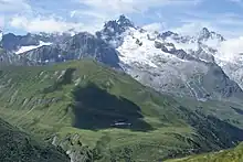 Le glacier du Dolent dominé par le mont Dolent vus depuis le val Ferret à l'est. | |||
