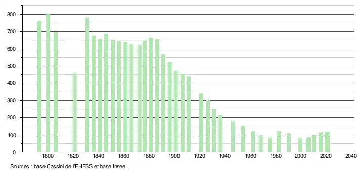 L'évolution du nombre d'habitants est connue à travers les recensements de la population effectués dans la commune depuis 1793. Pour les communes de moins de 10 000 habitants, une enquête de recensement portant sur toute la population est réalisée tous les cinq ans, les populations légales des années intermédiaires étant quant à elles estimées par interpolation ou extrapolation[16]. Pour la commune, le premier recensement exhaustif entrant dans le cadre du nouveau dispositif a été réalisé en 2005[17].