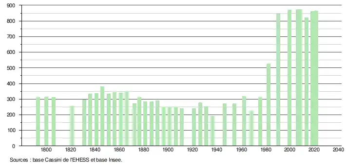 L'évolution du nombre d'habitants est connue à travers les recensements de la population effectués dans la commune depuis 1793. Pour les communes de moins de 10 000 habitants, une enquête de recensement portant sur toute la population est réalisée tous les cinq ans, les populations légales des années intermédiaires étant quant à elles estimées par interpolation ou extrapolation[25]. Pour la commune, le premier recensement exhaustif entrant dans le cadre du nouveau dispositif a été réalisé en 2008[26].