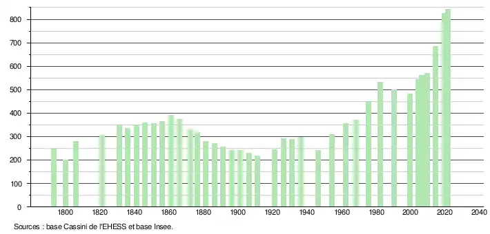 L'évolution du nombre d'habitants est connue à travers les recensements de la population effectués dans la commune depuis 1793. Pour les communes de moins de 10 000 habitants, une enquête de recensement portant sur toute la population est réalisée tous les cinq ans, les populations légales des années intermédiaires étant quant à elles estimées par interpolation ou extrapolation[27]. Pour la commune, le premier recensement exhaustif entrant dans le cadre du nouveau dispositif a été réalisé en 2004[28].