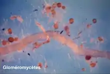 Plus précisément ces hyphes sont dites coénocytiques car leur multiplication végétative se fait de manière asexuée par le développement blastique de la pointe de l'hyphe pour produire des spores[2] ou glomérospores d'un diamètre de 80 à 500 μm[3]. Dans certains cas, des spores complexes se forment dans un saccule terminal[2].