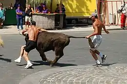 - jeux participatifs ayant lieu lors des fêtes locales. Ils comprennent notamment l'abrivado, le bandido, l'encierro, et le toro-piscine[16].