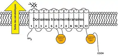 Ce transporteur est constitué d’un seul monomère, formé de 12 domaines transmembranaires (dodécahélicoïdal) et de deux sites de liaisons nucléotidiques. Ces derniers sont situés entre les domaines transmembranaires 6 et 7 et après le domaine transmembranaire 12. Les parties amino et carboxyterminale de la protéine se situent dans le cytoplasme. Ces domaines interagissent ensemble pour former, dans la membrane plasmique, un pore possédant sur sa face cytoplasmique les deux domaines de liaison à l’ATP[6]. Les substrats de la glycoprotéine P sont nombreux, mais ils sont caractérisés par leur nature hydrophobe ou amphiphile et un poids moléculaire entre 330 et 4 000 Da[6]. Les substrats se lient aux domaines 6, 11 et 12 du pore, provoquant l’exposition des sites de liaison nucléotidique. Un ATP vient ainsi se lier sur un de ces domaines, provoquant un changement de conformation des domaines transmembranaires résultant en l’ouverture du pore et l’expulsion du substrat. Les domaines nucléotidiques fonctionnent de façon alternée, la liaison de l’ATP à un des sites inhibant le deuxième. Ainsi, la glycoprotéine P nécessite un ATP par substrat pour l’éjecter.