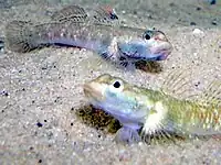Les gobies forment parfois des rapports symbiotiques avec d'autres espèces[5]. Quelques espèces de gobies vivent en symbiose avec certaines crevettes « fouisseuses » (notamment les crevettes du genre Alpheus[6], par exemple le Gobie commensal, Amblyeleotris steinitzi qui s'associe avec la crevette Alpheus djeddensis[7]). Le gobie creuse un "terrier" dans le sable que la crevette entretient, et dans lequel la crevette et les gobies vivent. La crevette a mauvaise vue comparativement au gobie, mais si elle le voit ou le sent brutalement rentrer dans le trou, elle le suit. Le gobie et la crevette restent en contact, la crevette utilisant ses antennes et le gobie effleurant la crevette avec sa queue lorsqu'il est alarmé. Chacun des deux gagne de cette relation : la crevette obtient un avertissement à l'approche d'un danger, et le gobie obtient une maison sûre et un endroit dans lequel pondre ses œufs.
