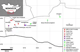 Il n'est connu que par un seul spécimen constitué d'un squelette incomplet, référencé MPC-D 102/111. Ces restes fossiles ont été mis au jour en Mongolie dans la formation géologique de Nemegt datant de la fin du Crétacé supérieur, du Maastrichtien inférieur, soit il y a environ entre 71 et 69 Ma (millions d'années)[3].