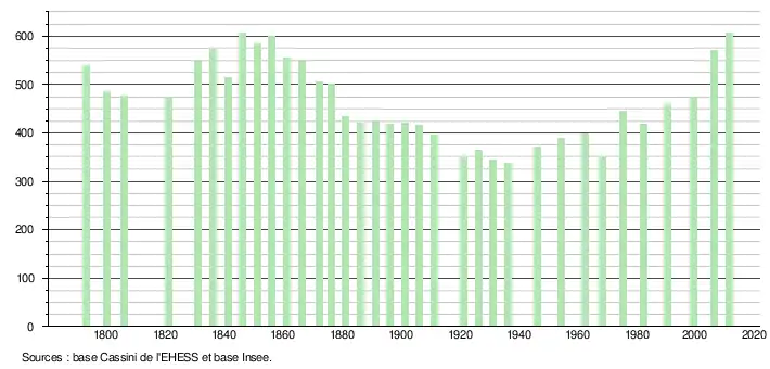 L'évolution du nombre d'habitants est connue à travers les recensements de la population effectués dans la commune depuis 1793. À partir du , les populations légales des communes sont publiées annuellement dans le cadre d'un recensement qui repose désormais sur une collecte d'information annuelle, concernant successivement tous les territoires communaux au cours d'une période de cinq ans. Pour les communes de moins de 10 000 habitants, une enquête de recensement portant sur toute la population est réalisée tous les cinq ans, les populations légales des années intermédiaires étant quant à elles estimées par interpolation ou extrapolation[6]. Pour la commune, le premier recensement exhaustif entrant dans le cadre du nouveau dispositif a été réalisé en 2006[7],[Note 1].