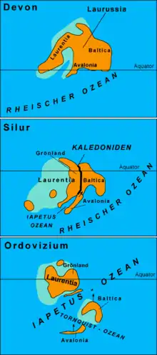 Pendant la période suivante, de l'Ordovicien au Carbonifère, des terranes (fragments de continents) vont progressivement se détacher du Gondwana (qui se situe alors autour du pôle Sud) et dériver vers le nord : le terrane d'Avalonia s'en détache vers 490 Ma, suivi par les blocs armoricain et ibérique vers 430 Ma, puis les blocs chinois et indochinois vers 400 Ma.