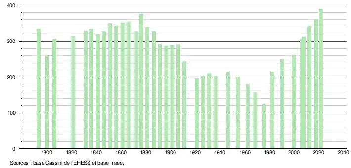 L'évolution du nombre d'habitants est connue à travers les recensements de la population effectués dans la commune depuis 1793. Pour les communes de moins de 10 000 habitants, une enquête de recensement portant sur toute la population est réalisée tous les cinq ans, les populations légales des années intermédiaires étant quant à elles estimées par interpolation ou extrapolation[14]. Pour la commune, le premier recensement exhaustif entrant dans le cadre du nouveau dispositif a été réalisé en 2007[15].