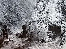 Les gorges des Schöllenen en 1934, avec la route la parcourant et, en arrière-plan à gauche, les voies de chemin de fer.