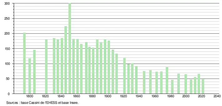 L'évolution du nombre d'habitants est connue à travers les recensements de la population effectués dans la commune depuis 1793. Pour les communes de moins de 10 000 habitants, une enquête de recensement portant sur toute la population est réalisée tous les cinq ans, les populations légales des années intermédiaires étant quant à elles estimées par interpolation ou extrapolation[32]. Pour la commune, le premier recensement exhaustif entrant dans le cadre du nouveau dispositif a été réalisé en 2006[33].