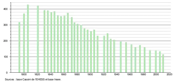 - Dans le tableau des recensements et le graphique, par convention dans Wikipédia, le principe a été retenu, pour les populations légales postérieures à 1999 de n’afficher dans le tableau des recensements et le graphique que les populations correspondant à l'année 2006, première population légale publiée calculée conformément aux concepts définis dans le décret no 2003-485 du 5 juin 2003, et les années correspondant à une enquête exhaustive de recensement pour les communes de moins de 10 000 habitants, ainsi que la dernière population légale publiée par l’Insee.
