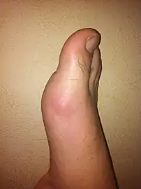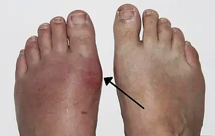 Elle ne doit pas être confondue avec l'hallux valgus, simple déformation du premier métatarse du gros orteil, d'origine génétique ou parfois mécanique (alors par exemple causée par des chaussures inadaptées).