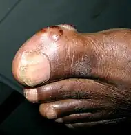 Tophus sur un orteil et au-dessus de la malléole externe.