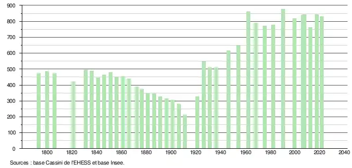 L'évolution du nombre d'habitants est connue à travers les recensements de la population effectués dans la commune depuis 1793. Pour les communes de moins de 10 000 habitants, une enquête de recensement portant sur toute la population est réalisée tous les cinq ans, les populations légales des années intermédiaires étant quant à elles estimées par interpolation ou extrapolation[20]. Pour la commune, le premier recensement exhaustif entrant dans le cadre du nouveau dispositif a été réalisé en 2007[21].