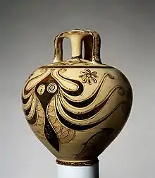 Au début du IIe millénaire av. J.-C., durant l'âge du bronze moyen, émerge la première culture complexe de la Grèce, la civilisation minoenne qui s'est développée à partir de la Crète. Elle doit son nom au mythique roi crétois Minos, connu par la tradition grecque postérieure, qui a peut-être conservé par ce biais un lointain souvenir de cette civilisation. C'est une civilisation souvent désignée comme « palatiale », la première période étant dite comme « protopalatiale » (v. -), parce qu'elle voit l'apparition d'un ensemble de constructions considérées comme étant des palais (à Cnossos, Phaistos, Malia, Zakros), même si leur fonction exacte est débattue (ils semblent avoir une fonction rituelle importante). L'organisation politique de l'époque est inconnue, quoiqu'il soit manifeste qu'elle s'inspire de celles des cultures du Proche-Orient et d’Égypte de l'époque. Des centres urbains se constituent, l'artisanat se développe (céramique, métallurgie). C'est alors que l'écriture apparaît avec les hiéroglyphes crétois et le linéaire A, mais ces systèmes ne sont pas traduits. Les textes, souvent sur tablettes d'argile, sont de nature administrative. Le début de la période néopalatiale (v. -) voit la destruction des palais, puis une reprise autour de Cnossos qui semble devenue hégémonique. La culture minoenne s'étend sur les îles voisines de l'Égée, et aussi vers le continent, où la culture helladique connaît un essor, avec l'apparition de tombeaux monumentaux au riche matériel funéraire (tombes « royales » de Mycènes)[35],[36],[37]. La culture cycladique, qui était particulièrement prospère au début de l'âge du bronze, développe au même moment des centres urbains, sous influence minoenne (Akrotiri sur Santorin), avant de connaître une phase de déprise après le milieu du IIe millénaire av. J.-C.[38]