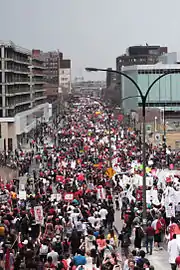 La manifestation étudiante du a rassemblé entre 100 000 et 200 000 étudiants et membres de la société civile[89],[90] s'opposant à la hausse des frais de scolarité prévue par le gouvernement de Jean Charest au centre-ville de Montréal. Elle avait comme point de départ la Place du Canada et se terminait sur la Place Jacques-Cartier dans le Vieux-Port où les leaders étudiants ont tenu plusieurs discours.