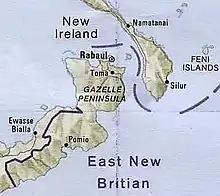 - La région sous administration australienne depuis la fin de la Première Guerre mondiale (mandat de la Société des Nations de 1921[2]) est, à cette époque, dénommée territoire de Nouvelle-Guinée. En 1945, sa fusion avec le territoire de Papouasie donne naissance au territoire de Papouasie et Nouvelle-Guinée (tutelle australienne entérinée par l'ONU en 1949[2]) ; la Papouasie-Nouvelle-Guinée obtenant son indépendance le 16 septembre 1975.