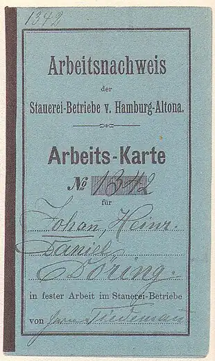 Un problème supplémentaire est l'absence de toute médiation ou contrôle régulier de la part des autorités. Le recrutement des travailleurs a le plus souvent lieu dans les bars du port, qui seront jusqu'au XXe siècle de « véritables centres de recrutement »[10]. La probabilité de trouver du travail dépend ainsi de la consommation et des relations personnelles avec les aubergistes et agents. Ces formes de recrutement prospèrent dans un marché du travail caractérisé par un important niveau de chômage. Les armateurs et commerçants ne choisissent plus eux-mêmes le personnel dont ils ont besoin au port, mais confient cette tâche à des sous-traitants appelés baas[11], et à leurs chefs d'équipe, les vize. À côté de cela, certaines unions d'entrepreneurs de Hambourg décident d'instaurer de leur propre initiative des certificats de travail. Ils espèrent ainsi débarrasser complètement le marché du travail des travailleurs jugés indésirables. Ce système de certificats contrôlé par les employeurs, appelé « système de Hambourg », s'étendra à toute l'Allemagne[12].