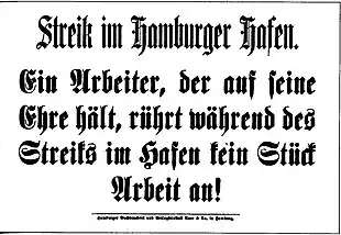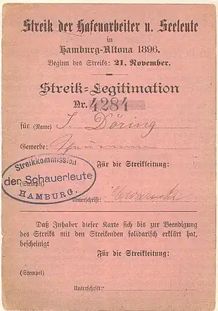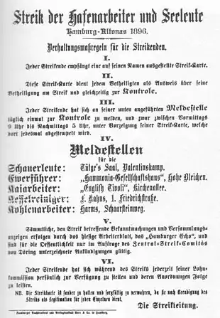 Le 12 novembre 1896, une assemblée de membres de l'Union refuse de soutenir les dockers chargés des marchandises de détail, qui souhaitaient faire la grève. Mais quatre jours plus tard, la situation se retourne. Lors d'une seconde assemblée, et contre l'avis de tous les responsables syndicaux, la majorité des membres présents vote son soutien aux dockers. Le 20 novembre[18],[20] est décidée à une large majorité la grande grève, que l'on retiendra sous le nom de « grève des dockers de Hambourg ». Même les membres de l'union des travailleurs portuaires décident de cesser le travail à partir du lendemain. Les entrepreneurs avaient pourtant déjà donné leur accord en vue d'une augmentation générale des salaires. Cependant, ils souhaitaient dans le même temps diminuer les primes pour manutention de marchandises insalubres. À ce moment-là, personne ne s'attend à ce que la grève dégénère en une lutte sociale s'étalant sur de nombreuses semaines. La durée envisagée n'est que d'une à deux semaines.