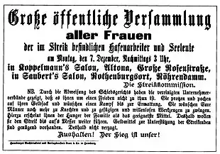L'organisation de cette grève apporte également un autre élément nouveau : des réunions destinées spécifiquement aux épouses des grévistes. Ces discours visent à empêcher la formation de conflits au sein des familles et ainsi un écroulement du mouvement de grève. C'est une tactique relativement nouvelle qui sera jugée positive par les organisateurs de la grève. Luise Zietz, qui intervient elle-même dans ces réunions, les vantera lors des journées du parti SPD d'octobre 1897[29].