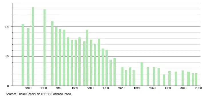 L'évolution du nombre d'habitants est connue à travers les recensements de la population effectués dans la commune depuis 1793. Pour les communes de moins de 10 000 habitants, une enquête de recensement portant sur toute la population est réalisée tous les cinq ans, les populations légales des années intermédiaires étant quant à elles estimées par interpolation ou extrapolation[19]. Pour la commune, le premier recensement exhaustif entrant dans le cadre du nouveau dispositif a été réalisé en 2007[20].