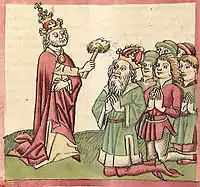 |   Le pape Grégoire V et l'empereur Otton III, illustration de l'atelier de Diebold Lauber (vers 1450). | ||||||||