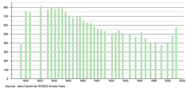 L'évolution du nombre d'habitants est connue à travers les recensements de la population effectués dans la commune depuis 1793. À partir du , les populations légales des communes sont publiées annuellement dans le cadre d'un recensement qui repose désormais sur une collecte d'information annuelle, concernant successivement tous les territoires communaux au cours d'une période de cinq ans. Pour les communes de moins de 10 000 habitants, une enquête de recensement portant sur toute la population est réalisée tous les cinq ans, les populations légales des années intermédiaires étant quant à elles estimées par interpolation ou extrapolation[12]. Pour la commune, le premier recensement exhaustif entrant dans le cadre du nouveau dispositif a été réalisé en 2006[13],[Note 1].