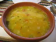 - Mettre à bouillir le quinoa. Faire sauter de petits morceaux de porc salé avec oignons et ail finement hachés. Ajouter le manteca de color et laisser bouillir 30 min. Ajouter le quinoa, les pommes de terre coupées en tranche et laisser bouillir 15 min. Puis ajouter les cacahuètes préalablement dissoutes dans le lait. Ajouter la coriandre. (Mikuy et Mikury 2013)