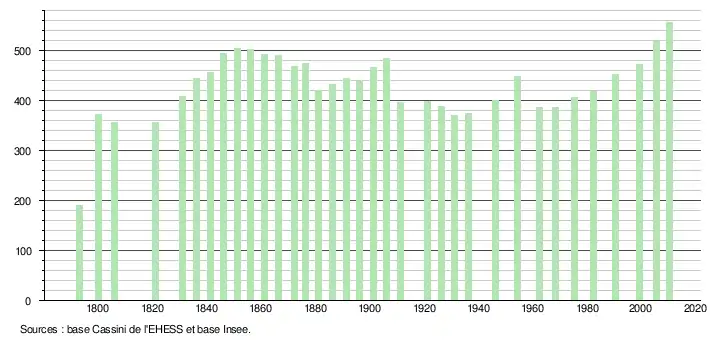 L'évolution du nombre d'habitants est connue à travers les recensements de la population effectués dans la commune depuis 1793. À partir du , les populations légales des communes sont publiées annuellement dans le cadre d'un recensement qui repose désormais sur une collecte d'information annuelle, concernant successivement tous les territoires communaux au cours d'une période de cinq ans. Pour les communes de moins de 10 000 habitants, une enquête de recensement portant sur toute la population est réalisée tous les cinq ans, les populations légales des années intermédiaires étant quant à elles estimées par interpolation ou extrapolation[4]. Pour la commune, le premier recensement exhaustif entrant dans le cadre du nouveau dispositif a été réalisé en 2005[5],[Note 1].