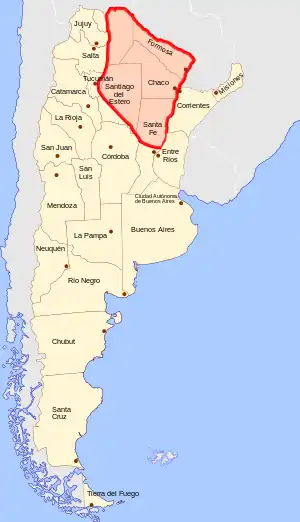 - Chaco Austral, qui s'étend du río Bermejo vers le sud, jusqu'à hauteur de la Mar Chiquita et du confluent du río Salado avec le Paraná, c’est-à-dire approximativement jusqu'au 30e parallèle sud.