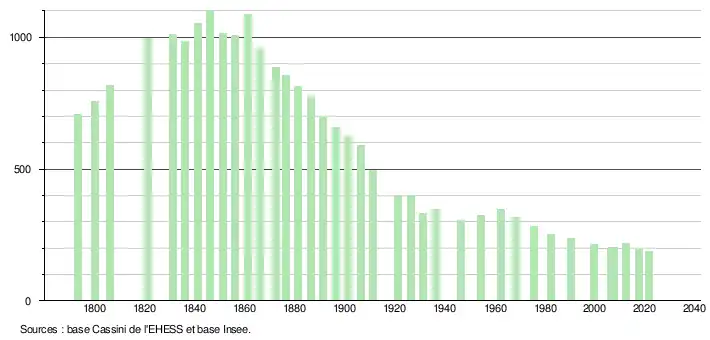 L'évolution du nombre d'habitants est connue à travers les recensements de la population effectués dans la commune depuis 1793. Pour les communes de moins de 10 000 habitants, une enquête de recensement portant sur toute la population est réalisée tous les cinq ans, les populations légales des années intermédiaires étant quant à elles estimées par interpolation ou extrapolation[16]. Pour la commune, le premier recensement exhaustif entrant dans le cadre du nouveau dispositif a été réalisé en 2007[17].