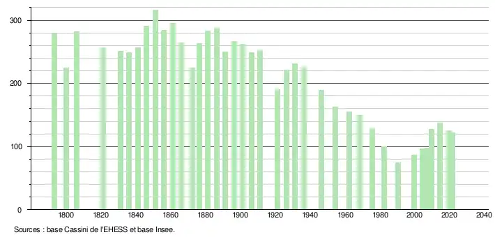 L'évolution du nombre d'habitants est connue à travers les recensements de la population effectués dans la commune depuis 1793. Pour les communes de moins de 10 000 habitants, une enquête de recensement portant sur toute la population est réalisée tous les cinq ans, les populations légales des années intermédiaires étant quant à elles estimées par interpolation ou extrapolation[17]. Pour la commune, le premier recensement exhaustif entrant dans le cadre du nouveau dispositif a été réalisé en 2004[18].