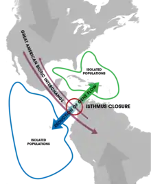 La formation de l'isthme de Panama a débuté par la subduction de la plaque Farallon, dont est issue l'actuelle plaque de Cocos, sous les plaques caraïbe et sud-américaine, entraînant le développement d'un arc volcanique. Ce dernier est apparu aux environs de 73 Ma lorsque la plaque caraïbe a commencé à se déplacer vers l'est, atteignant sa position actuelle vers 50 Ma. En parallèle, la convergence des plaques caraïbe et sud-américaine a produit la surrection à la fois des Andes du Nord et de la plaque de Panama[2]. La collision entre cette dernière et l'Amérique du Sud a débuté aux alentours de 23 - 25 Ma[39]. Durant cette période, l'arc de Panama formait vraisemblablement une série d'îles séparées par des détroits, dont certains atteignaient 1 200 m de profondeur, permettant des échanges encore importants entre l'océan Pacifique et la mer des Caraïbes. Ces échanges d'eau profonde sont interrompus autour de 9,2 Ma, mais des eaux de surface continuent de passer, suggérant de forts courants interocéanique (qui dissuadent peut-être la migration des espèces terrestres)[2]. Enfin, on enregistre un pic de divergence des espèces marines de la zone néritique entre les deux océans vers 3,2 Ma[2]. Ces observations, couplées à celles des contrastes des assemblages de plancton marin et de salinité des eaux, fixent la fermeture de l'isthme stricto sensu à 2,8 Ma[2]. Cet événement coïncide avec un épisode de glaciation qui a donné lieu à un abaissement significatif du niveau de la mer[2].