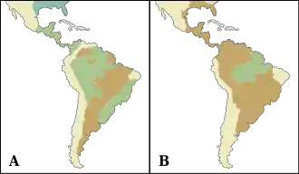 La reconstruction de la végétation d'Amérique centrale au moment du dernier maximum glaciaire (18 000 ans avant le présent) reflète un climat nettement plus froid qu'aujourd'hui, avec des températures de surface de 4 à 7 °C plus basses, et une des couvertures forestières probablement plus ouvertes, en raison des niveaux plus faibles de CO2 atmosphérique et de précipitations moindres (de 30% à 50%)[51]. On observait aussi du côté des Caraïbes une zone côtière plus étendue qu'aujourd'hui grâce à l'abaissement du niveau de la mer consécutif à la mobilisation des eaux dans les calottes glaciaires[52]. Ces conditions semblent avoir perduré jusqu'à 10 500 ans avant le présent et les forêts tropicales de basses terres qui couvrent désormais le pont terrestre entre les deux Amériques ne seraient apparues qu'après cette période. Les mammifères adaptés à la savane ont donc pu bénéficier le long des côtes de l'Amérique centrale des habitats secs et ouverts nécessaires à leur dispersion durant la majeure partie du Pléistocène[51].