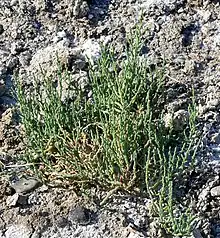 - La zone à Atriplex confertifolia correspond aux zones de faibles élévations où le sel et/ou les particules argileuses les plus fines se sont accumulés. Dans les zones où la salinité du sol est modérée, les Chenopodiaceae halophiles dominent : on trouve des buissons d'Atriplex confertifolia et d'eurotie laineuse, ainsi que les genres Sarcobatus, Allenrolfea, Kochia, Salicornia, Suaeda, mais aussi une Poaceae halophyte, Distichlis. Dans les zones les plus riches en sel, les genres Allenrolfea et Distichlis dominent, parfois mêlés à des joncs de la Baltique (Juncus balticus) et à d'autres Poaceae (Sporobolus airoides) et à des Salicornia[3].