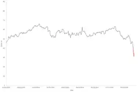 Le cours du pétrole a chuté consécutivement au ralentissement de l'économie chinoise puis de la concurrence entre l'Arabie Saoudite et la Russie avec des cours très volatiles d'un jour à l'autre ; le baril de Brent passant sous la barre des 60 dollars le , le plus bas depuis trois mois[112],[113]. Le , c'est celui du WTI qui passe sous le seuil de 50 dollars avant de descendre brièvement à un prix plancher de 20,2 dollars le avant de remonter à 25 dollars le 19 mars[114].