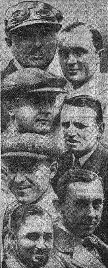 Candidats au Grand Prix de l'A.C.F. à Pau en 1930 (G en haut à D en bas Divo, Chiron, Williams, Étancelin, Le Houx, Dreyfus, et Sénéchal).