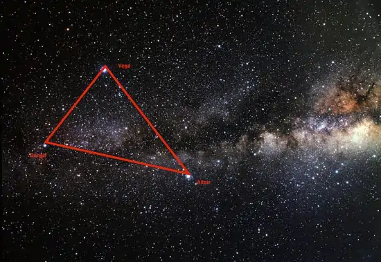 La Voie lactée sera alors visible, ainsi que plusieurs autres étoiles. D'abord, il faut localiser les étoiles qui forment le triangle d'été, soit Deneb, Altaïr et Véga[6]. Le Grand Rift se trouve en traçant une ligne imaginaire qui commence à Deneb et qui traverse le segment Altaïr/Véga[7].