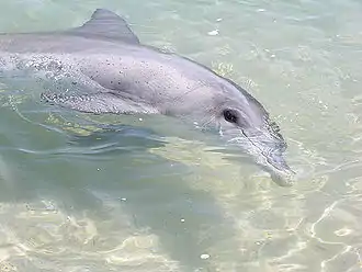 En 1997, des chercheurs ont observé l'utilisation d'outils chez les dauphins de la Baie Shark, en Australie. Ceux-ci y utilisaient des éponges marines, placées sur leur rostre, présumément pour protéger leur bouche lors de la recherche de nourriture dans les fonds sableux[53]. Ce comportement a été observé uniquement dans la baie Shark, et presque seulement chez les femelles. C'est l'unique cas connu d'utilisation d'outils par des mammifères marins, à l'exception des loutres. Une étude effectuée en 2005 a permis de démontrer que ce comportement est enseigné par les mères à leurs filles[54].