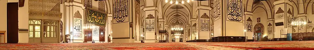 La mosquée possède 192 panneaux muraux monumentaux rédigés par les plus fameux calligraphes ottomans de l'époque, ce qui en fait l'un des plus grands exemples de styles calligraphiques arabes au monde. Ils sont écrits sur les murs, les colonnes ou des panneaux de tailles différentes.