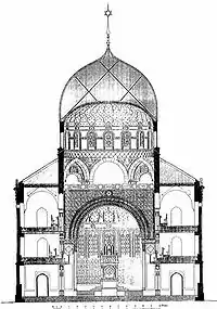 Le dôme en forme de bulbe repose sur un tambour cylindrique, qui repose lui-même sur une base à 16 facettes, elle-même disposée sur une base octogonale. Le tambour cylindrique est percé de 16 fenêtres à arc rond. Le dôme lui-même est constitué d'une double coquille. La coquille extérieure est en métal selon les plans originaux, et devait être recouverte d'une décoration métallique qui n'a pas été réalisée. Au-dessus du dôme, la flèche est terminée par une étoile de David à six branches.