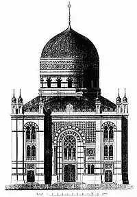 La synagogue de style mauresque est un bâtiment isolé situé à l'intersection de deux rues et faisant face à une troisième. Le bâtiment de deux étages au-dessus du rez-de-chaussée, se compose de deux parties: la partie ouest comprenant les vestibules, les escaliers et les bureaux de la communauté et la partie est formant le hall de prières avec une abside et couronné d'une grande coupole. La partie ouest est plus étroite que la partie est. Les murs sont en brique et crépi. La façade principale, où se situe l'entrée, est à l'ouest et le bâtiment est orienté d'ouest en est, avec l'abside, où est disposée l'Arche sainte, à l'est. Les hommes sont assis au rez-de-chaussée, au centre du hall de prières, et font face à l'Arche sainte, tandis que les femmes sont assises dans les deux étages de galeries situées sur les côtés ouest, nord et sud du hall.