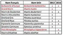 Parmi elles, 3 sont inscrites à l’annexe II de la Directive Habitat Faune Flore[25] : la Barbastelle d’Europe (Barbastella barbastellus), le Grand murin (Myotis myotis) et le Petit rhinolophe (Rhinolophus hipposideros)