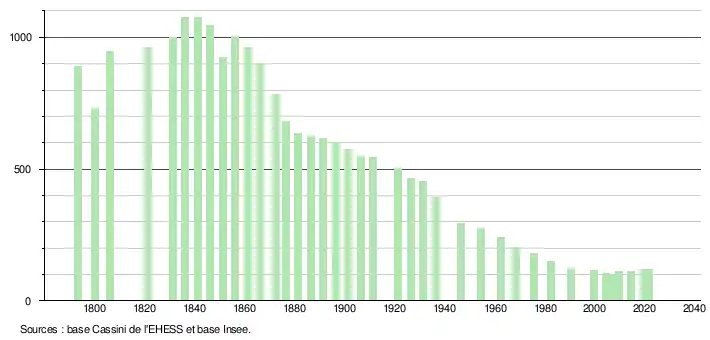 L'évolution du nombre d'habitants est connue à travers les recensements de la population effectués dans la commune depuis 1793. Pour les communes de moins de 10 000 habitants, une enquête de recensement portant sur toute la population est réalisée tous les cinq ans, les populations légales des années intermédiaires étant quant à elles estimées par interpolation ou extrapolation[16]. Pour la commune, le premier recensement exhaustif entrant dans le cadre du nouveau dispositif a été réalisé en 2004[17].